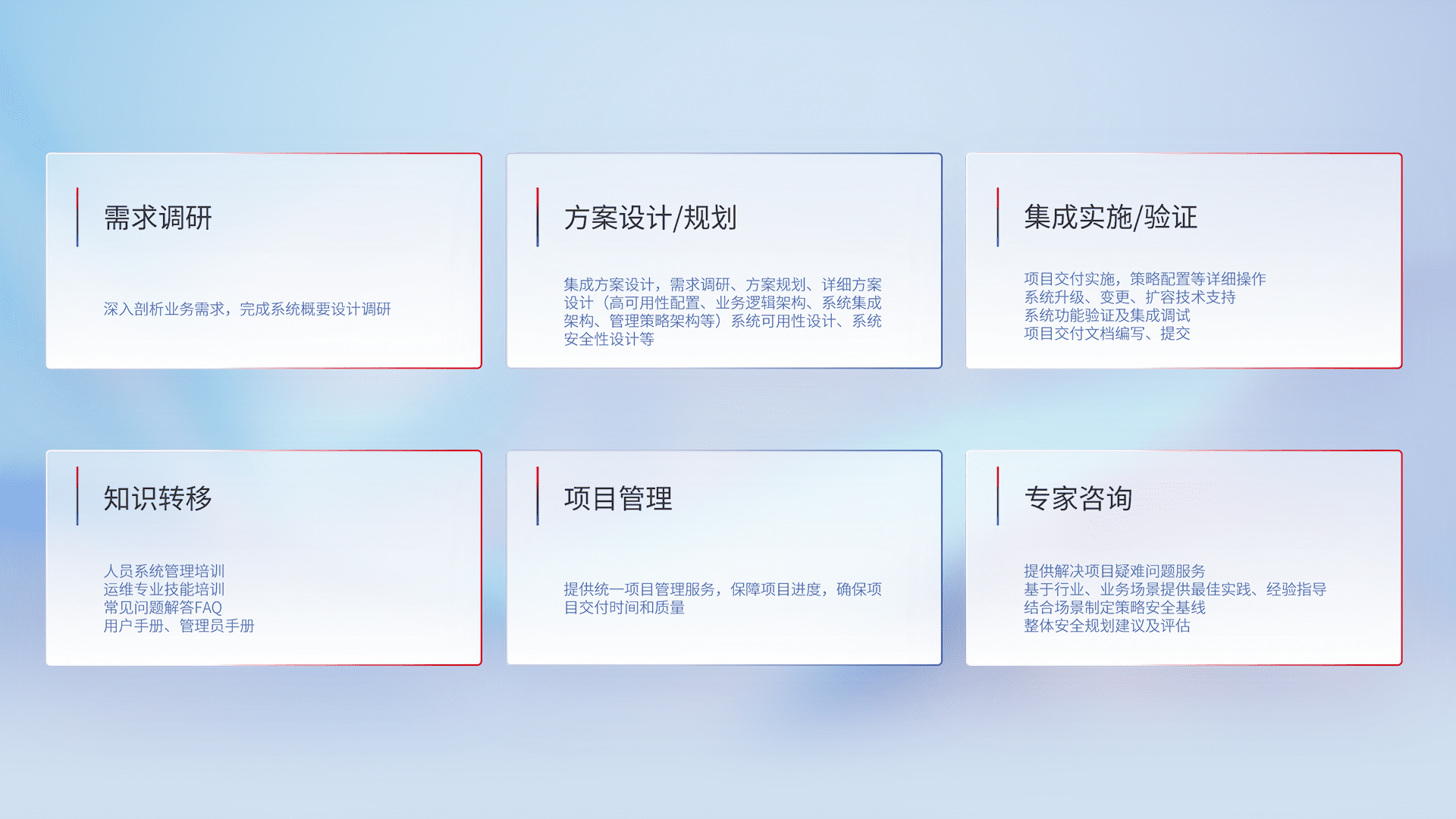 针对客户行业特性,,,将宏观的安全战略和需求,,,通过专业的交付服务,,,,实现项目落地,,,,为客户提供标准规范的集成交付服务。。。