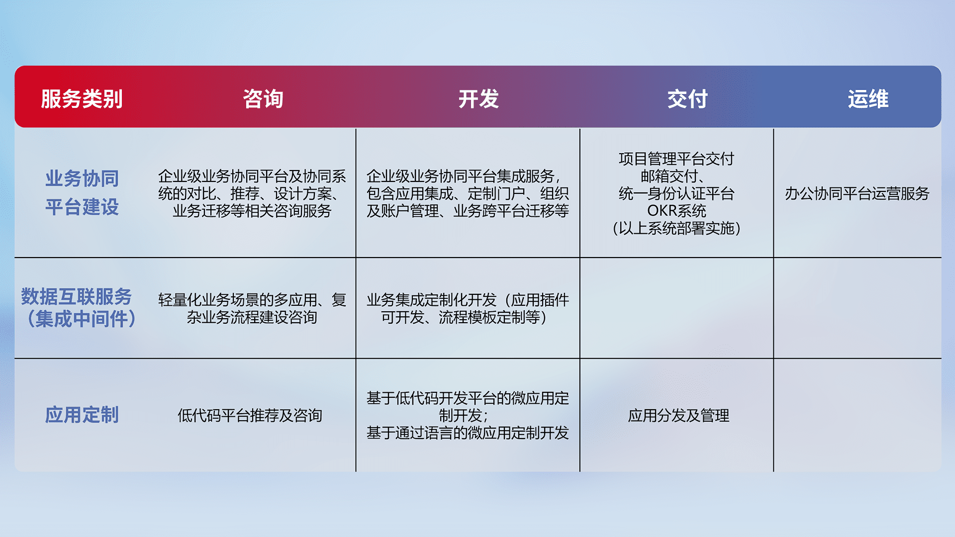 针对钉钉、、、企微、、、IDaas等平台级产品提供产品的规划、、、、方案、、、、交付、、、定制化开发等服务,,,实现如统一协同办公、、、智能客户服务、、混合会议管理、、智能数据查询、、等业务场景,,,实现数字化转型。。。